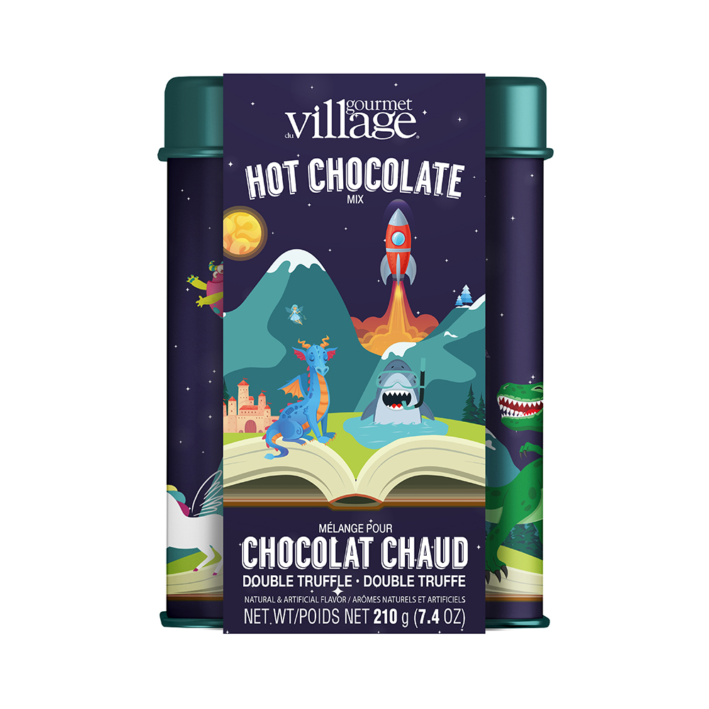Nos boîtes de chocolat chaud souvenirs, disponibles en designs uniques et colorés. Chaque boîte à couvercle est remplie de notre meilleur chocolat chaud Double Truffe, en quantité suffisante pour préparer 6 à 8 portions de délicieux chocolat chaud crémeux.