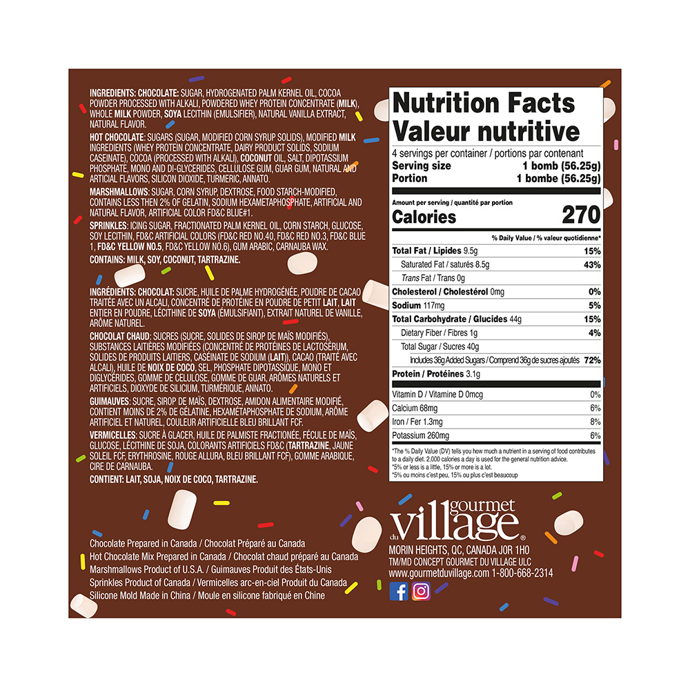 Ensemble comprenant tout ce qu’il vous faut pour confectionner 4 bombes de chocolat chaud double truffe et des vermicelles arc-en-ciel pour la garniture.