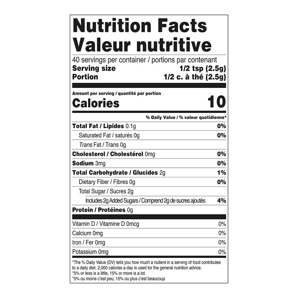 Poids net 100 g (3.05 oz). Donne 40 portions.