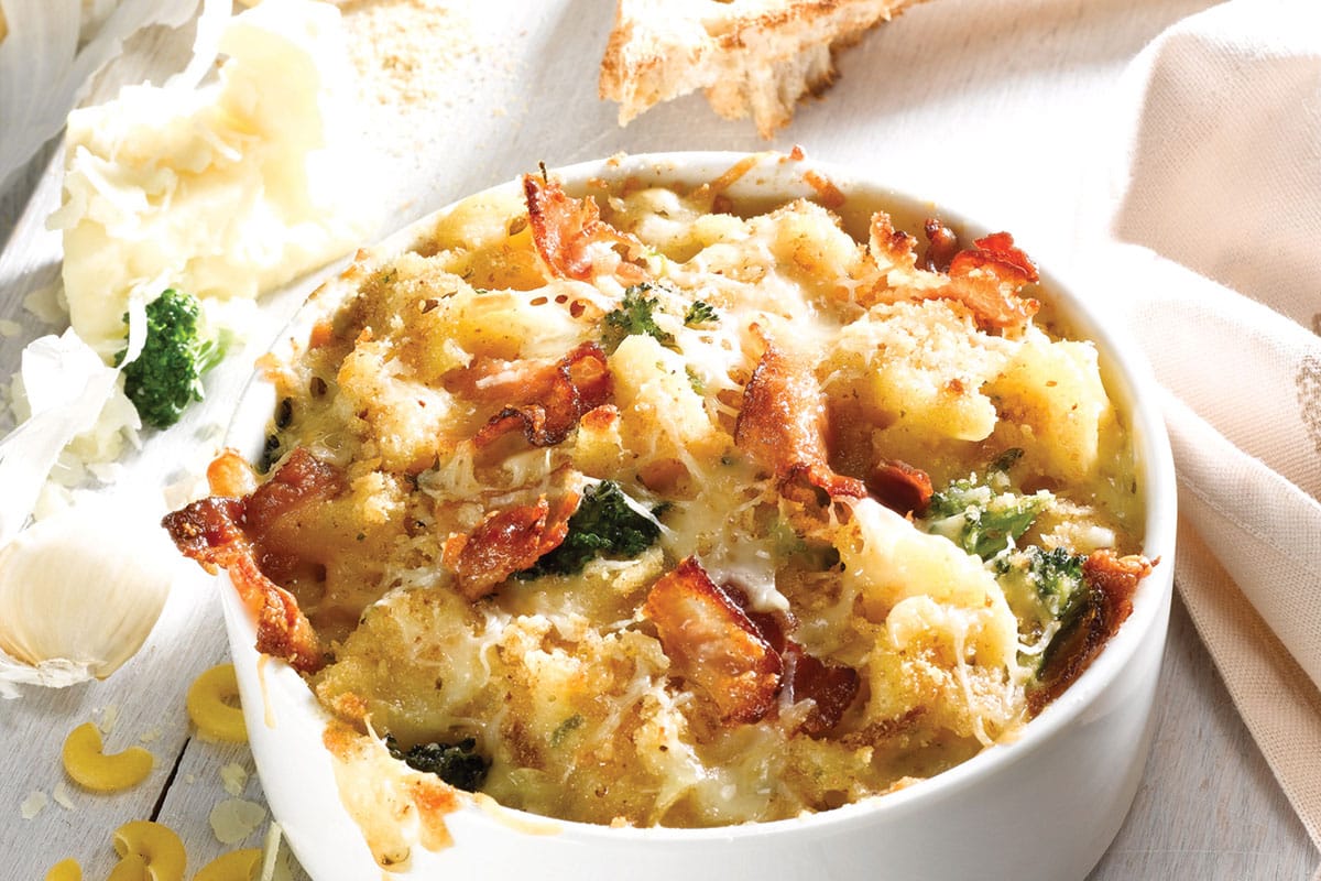 Ajouter graduellement les fromages jusqu'à ce qu'ils soient fondus, ajouter les herbes fraiches. Retirer du feu et ajouter le macaroni et brocoli. Verser le tout dans un plat allant au four (caquelon). Saupoudrer du fromage cheddar réservé, ajouter la chapelure et le bacon haché.