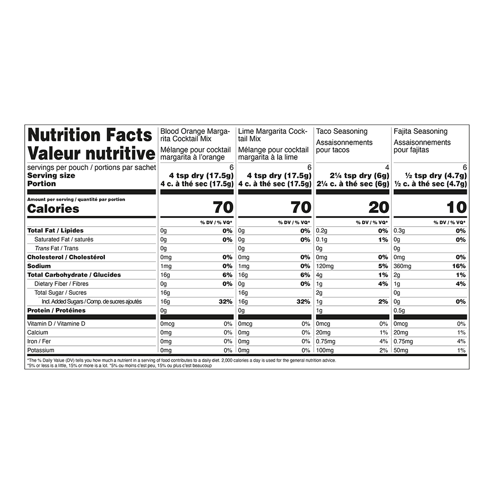 Includes four full-size mixes: Fajita Seasoning, Taco Seasoning, Lime Margarita Mix, and Blood Orange Margarita Mix.