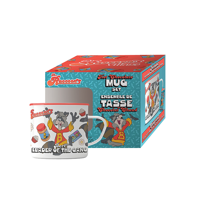 Our Raccoons “Bert” Mug set . Each gift set includes a 400ml (13 oz) retro looking ceramic mug and a single serve Peanut Butter flavored hot chocolate.