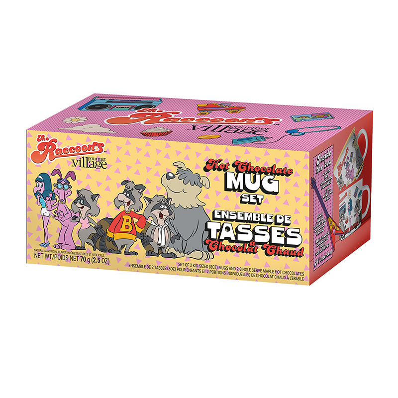 Each gift set includes 2 kid sized ceramic mugs, 250ml (8oz) capacity decorated with The Raccoons Gang characters featured on our Maple Chocolate minis. Inside this gift box you will find 2 single serve maple pouches  Hot Chocolates to go with the 2 mugs.