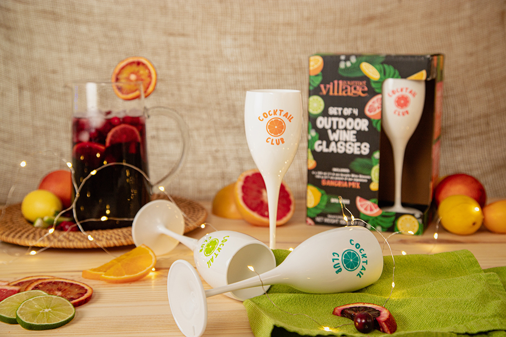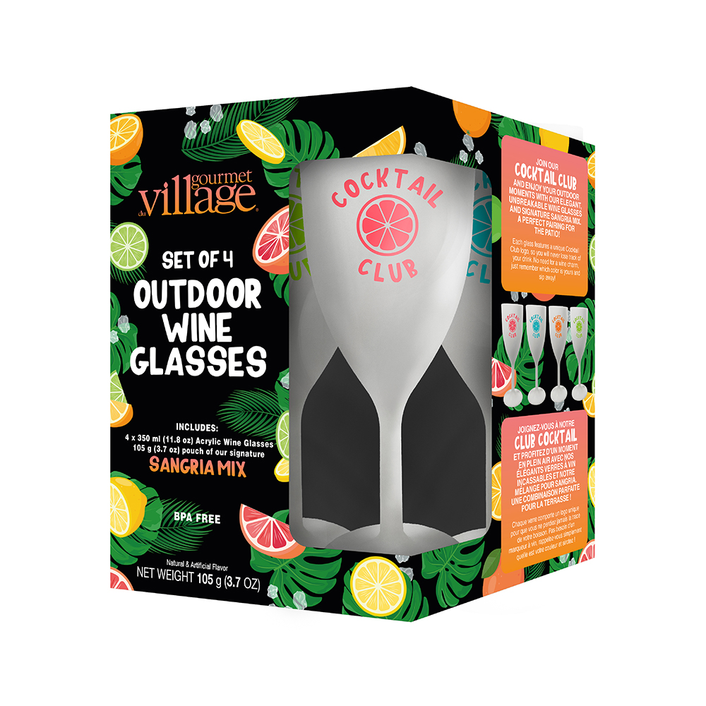 Includes four x 350 ml (11.8 oz.) wine glasses, and a 105 g (3.7 oz.) pouch of our signature Sangria Mix, all packaged in an elegant gift box.