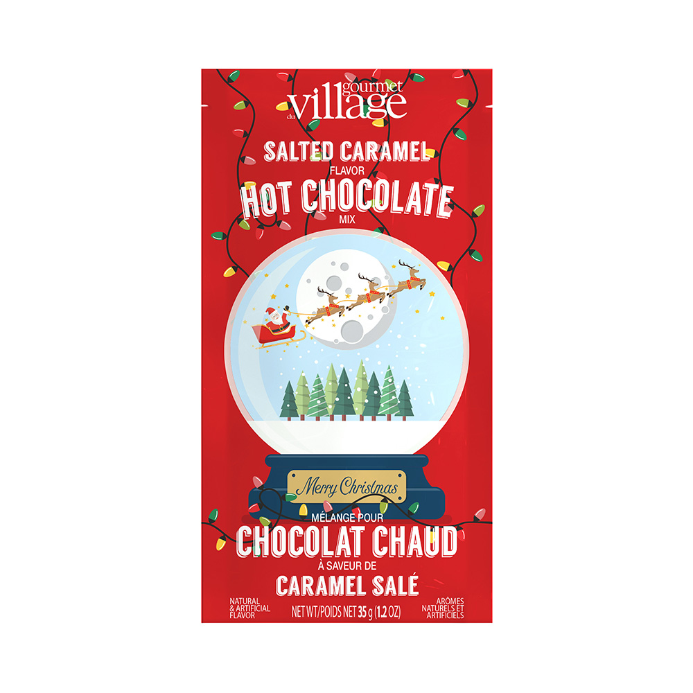 Snowglobe Gift Cup filled with Salted caramel flavored Hot Chocolate blend. The packaging has recently been completely redesigned. More decorative and more environmentally friendly. Recyclable cardboard cup now features a decorative theme wrapped all around, more fun to sip and enjoy. Each is filled with a matching pouch of our finest Hot Chocolate mix and is topped off with a dome filled with mini dehydrated marshmallows, enough to top off many cups of your favorite Hot Chocolate.